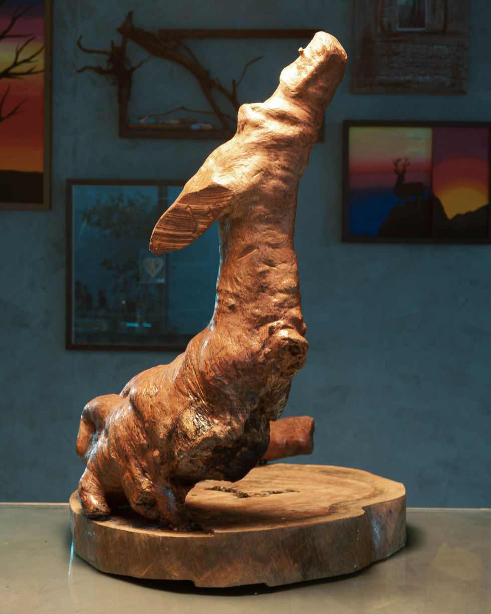 escultura de forma robusta e natural, composta inteiramente de madeira com acabamento polido e brilhante. O elemento principal é um tronco ou galho de aparência sinuosa e ascendente, que emerge de uma base circular de madeira bruta, como se brotasse do próprio chão. A peça possui uma curvatura dinâmica, que remete ao movimento de crescimento ou elevação — quase como uma dança lenta da natureza. Sua extremidade mais elevada se projeta para cima, evocando um gesto de busca ou expansão. A superfície da madeira exibe nós, veios e imperfeições naturais, realçados por um acabamento envernizado que valoriza sua cor âmbar intensa. Essas marcas revelam o passado vivo da matéria-prima, sugerindo idade, história e identidade. O pedestal é um disco rústico de madeira, que mantém o aspecto natural com bordas irregulares, remetendo a um corte direto de tronco. Ele ancora visualmente a escultura, proporcionando contraste entre estabilidade e ascensão.