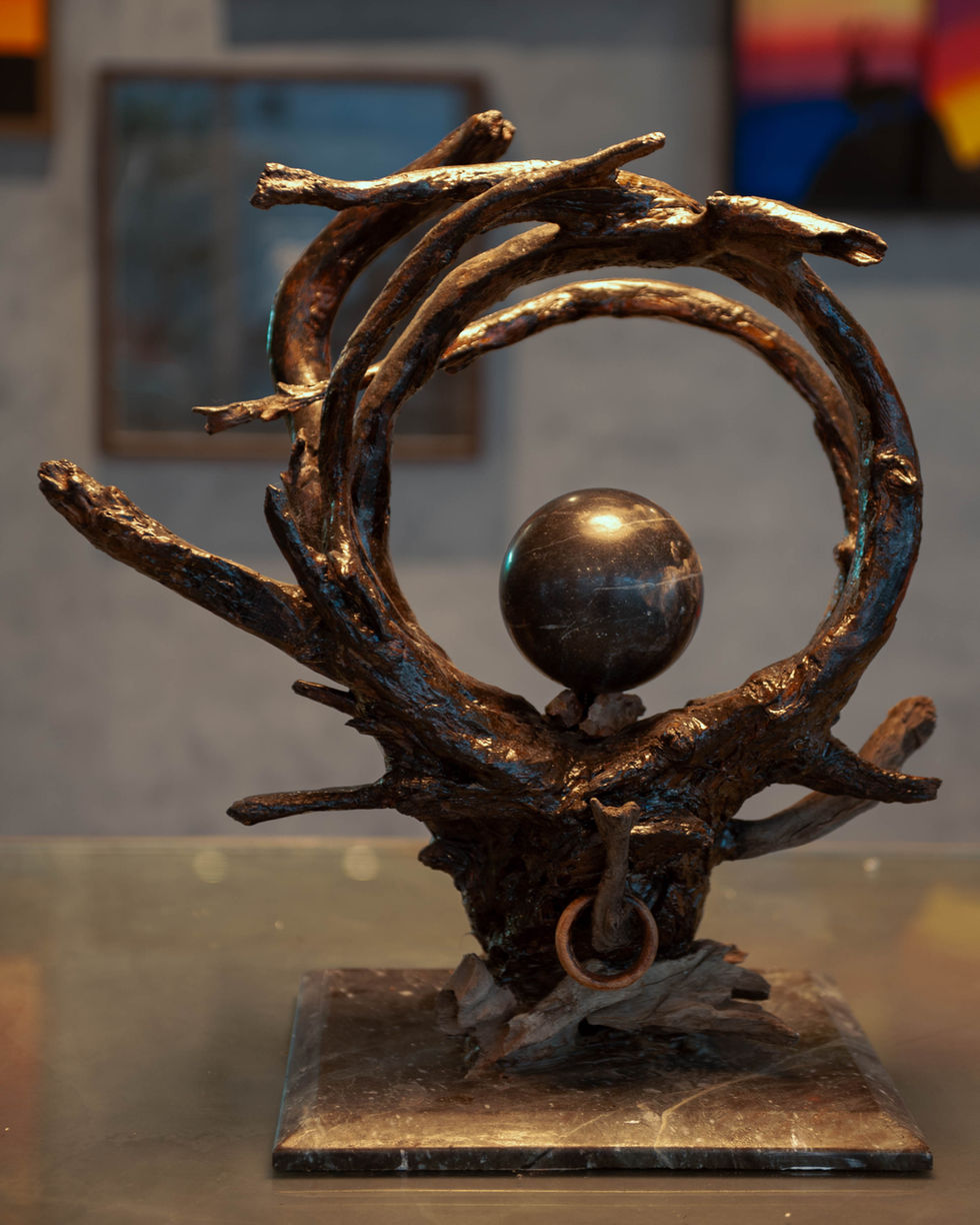 A composição da imagem apresenta uma escultura feita de madeira flutuante, com curvas e formas orgânicas. No centro da escultura, há uma esfera escura, polida, que se destaca em contraste com a madeira.