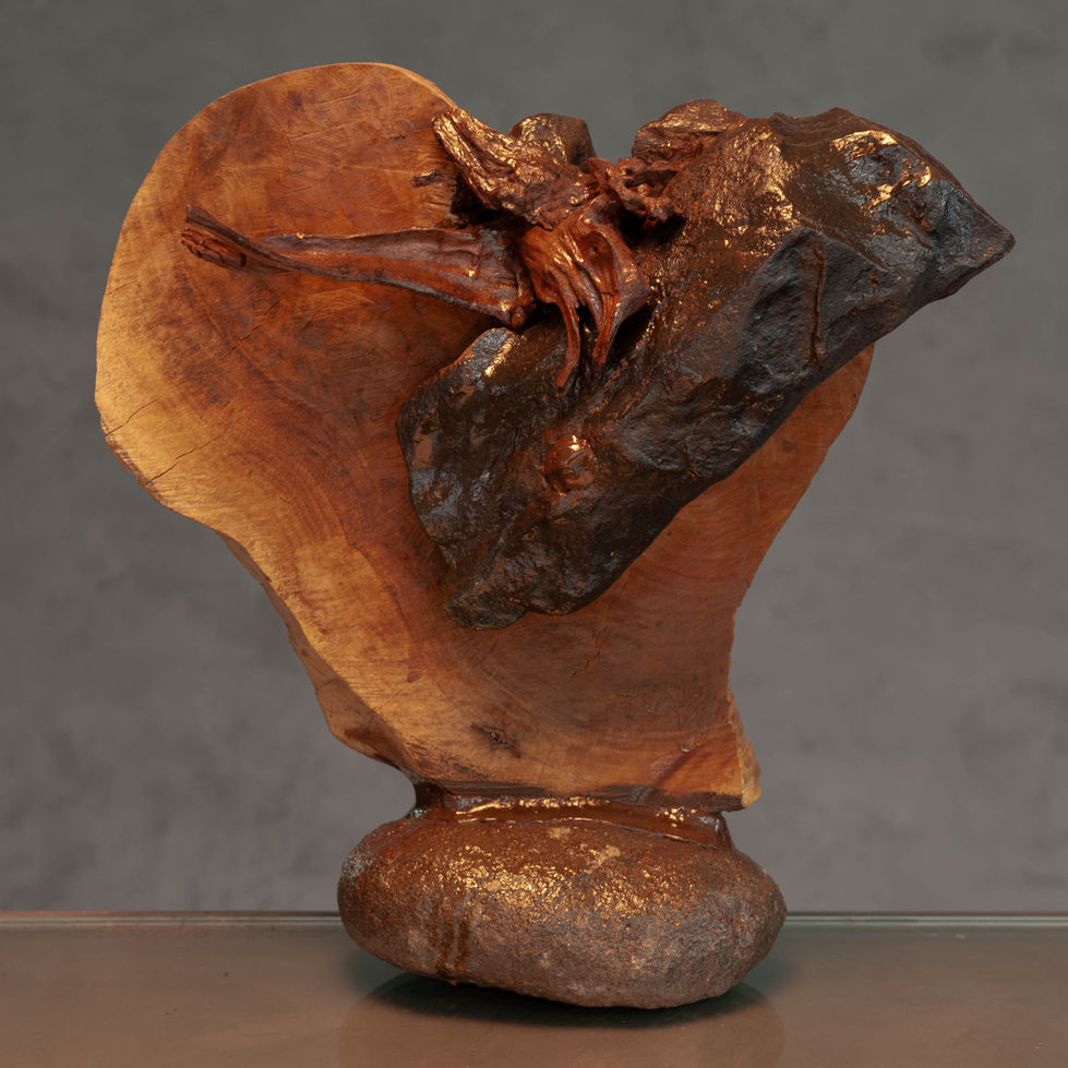 Um pedaço de madeira escurecida e robusta, com aparência quase rochosa ou carbonizada, parece estar parcialmente fundido ou emergindo do coração de madeira. Dele se projeta uma forma alongada, como um braço ou um galho retorcido, que lembra uma mão ou raiz em movimento — algo que pulsa ou tenta alcançar. A escultura repousa sobre uma pedra arredondada e firme, com acabamento brilhante, simbolizando a estabilidade, o peso da existência ou o fundamento emocional da peça.