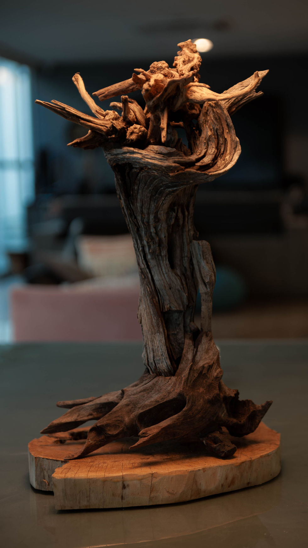 Erguida sobre uma base de madeira clara, a escultura apresenta uma estrutura vertical, orgânica e expressiva, formada por galhos e raízes entrelaçados que parecem se contorcer e ascender, como se algo estivesse despertando ou em vigília. A peça se ergue como um tronco vivo, com linhas ascendentes que remetem à força e ao crescimento. No topo, um emaranhado de fragmentos de madeira projeta-se em várias direções, sugerindo uma copa retorcida, uma coroa de galhos, um totem natural. A madeira tem aparência seca e antiga, com ranhuras profundas e tons terrosos — um verdadeiro testemunho do tempo e da matéria. A superfície bruta contrasta com o acabamento da base, evidenciando o respeito pela forma original e sua força visual. O pedestal em madeira clara e polida serve de âncora à peça, como se fosse o solo sagrado de onde o guardião emergisse.