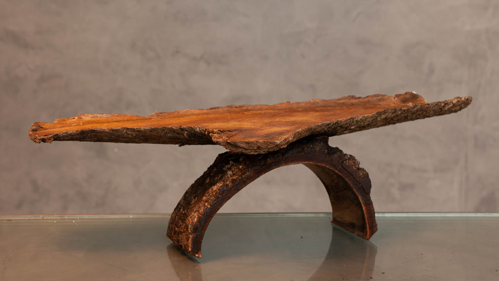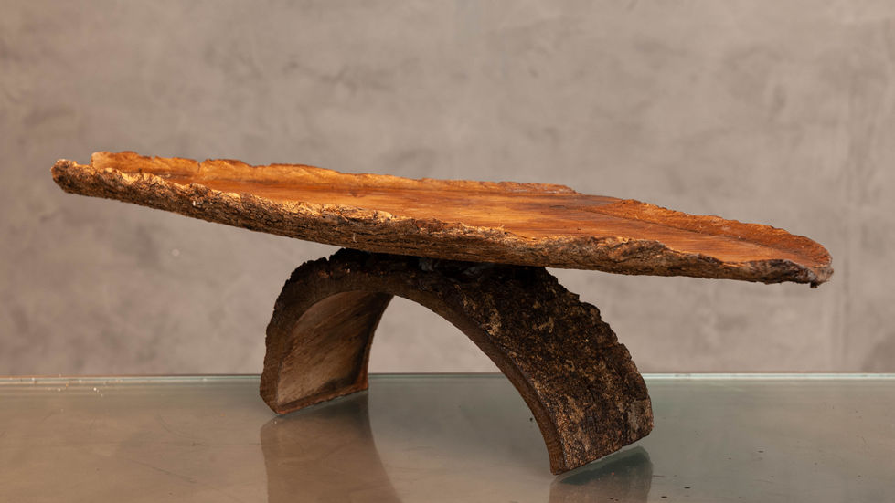 A obra tem uma estrutura que lembra uma mesa ou suporte com um tampo plano e irregular, apoiado sobre uma base arqueada. A parte superior é uma tábua de madeira com bordas naturais, mantendo a casca da árvore, o que acentua seu caráter rústico e autêntico. Feita inteiramente de madeira bruta. O tampo é um corte plano de tronco, enquanto a base arqueada é uma seção curva de galho, cortada para formar um arco funcional. A textura da casca foi preservada tanto no tampo quanto na base, o que confere um aspecto de continuidade e respeito ao material original.