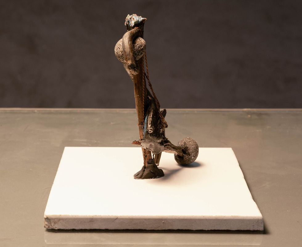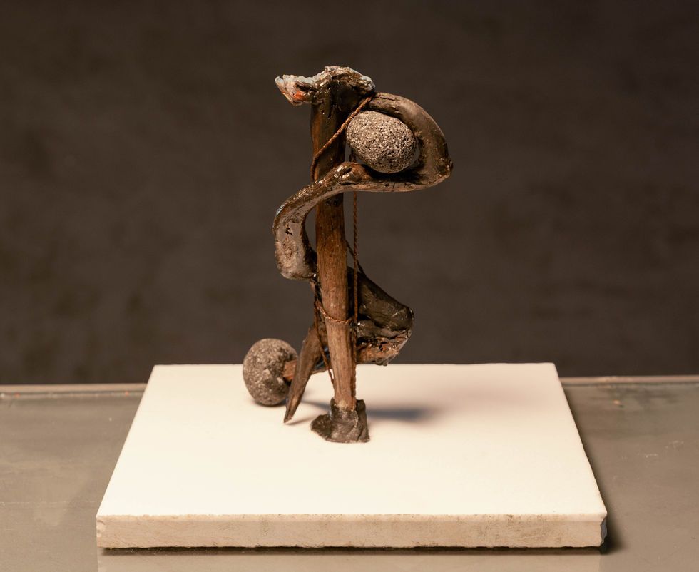 é uma obra intrigante e simbólica, que evoca de forma poética a energia vital em ascensão. Feita com materiais naturais — madeira, pedra e corda —, ela está disposta sobre uma base de mármore branco que contrasta com a densidade escura e texturizada da figura principal. Representa uma figura antropomórfica estilizada, em posição ereta e sinuosa, com o corpo espiralado como uma serpente que sobe pela própria espinha. Essa forma em espiral remete diretamente à simbologia do Kundalini, energia espiritual que, segundo tradições orientais, repousa na base da coluna vertebral e desperta subindo até o topo da cabeça.