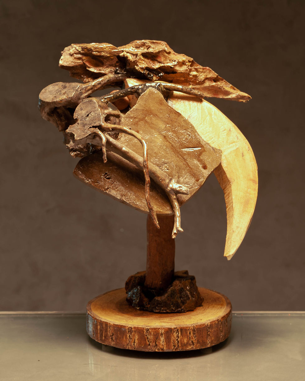 A escultura "Mistério da Meia-Noite" é apoiada sobre uma base circular de madeira bruta. A peça se projeta para o alto com camadas sobrepostas e texturas contrastantes. O destaque é uma lâmina curva de madeira clara que evoca a imagem de uma lua crescente, iluminando sutilmente os elementos mais escuros ao redor — galhos retorcidos, pedaços metálicos e fragmentos de madeira envelhecida.