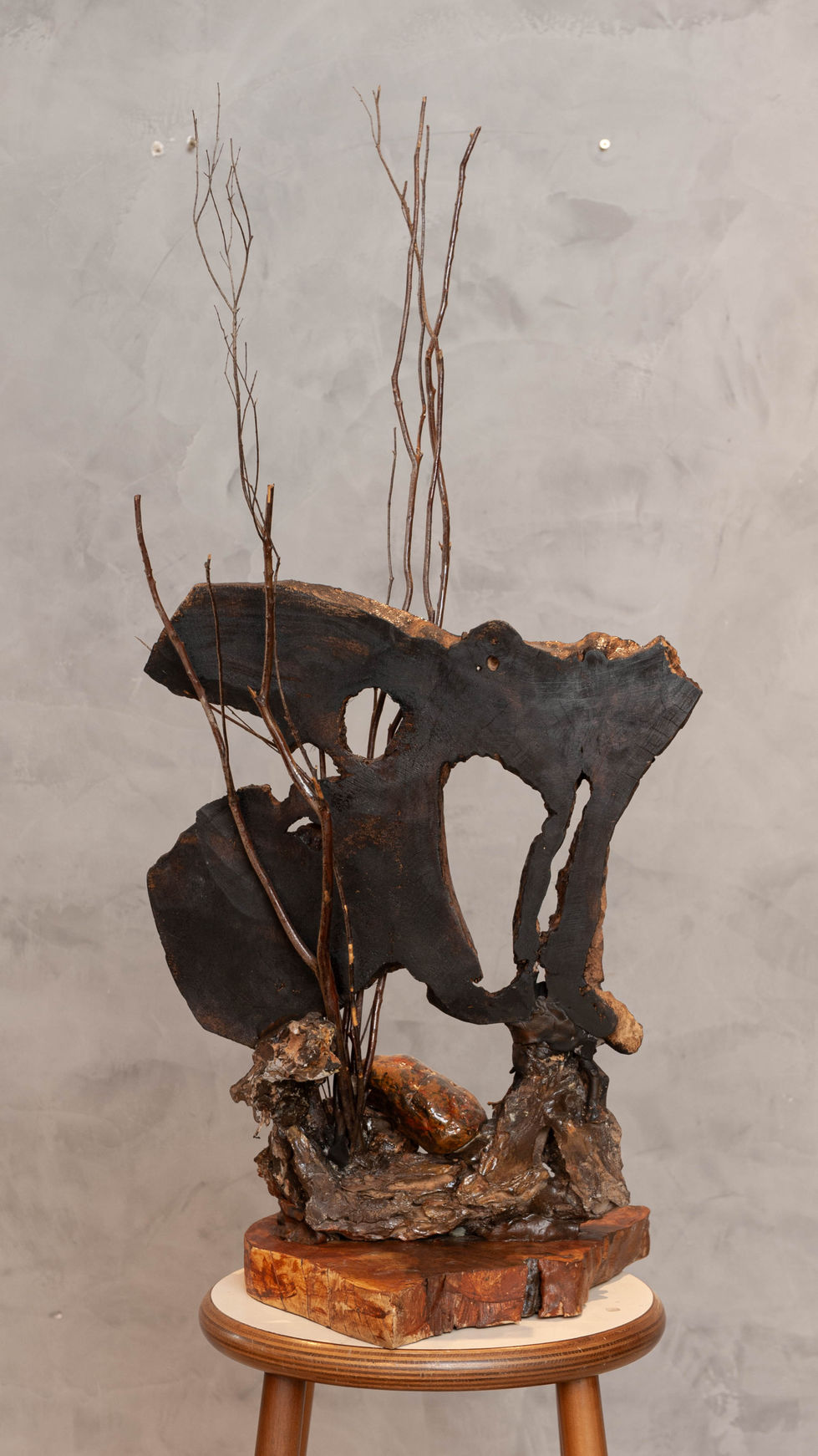 É uma composição poética e orgânica que evoca os elementos da natureza em sua forma mais essencial. A obra combina madeira, metal e galhos secos em um arranjo que transmite leveza e força ao mesmo tempo, como se capturasse o exato momento em que o vento atravessa uma paisagem bruta. A peça central parece ser uma lâmina de madeira escura e desgastada, com grandes aberturas orgânicas que se assemelham a erosões naturais ou à passagem do tempo. A forma vazada permite que a luz e o espaço atravessem a escultura, criando uma sensação de fluidez e movimento. Galhos finos e retos, secos, sobem da base em direções sinuosas e verticais. Eles se erguem como hastes frágeis ao vento, sugerindo um sopro que os impulsiona, como se dançassem no ar.