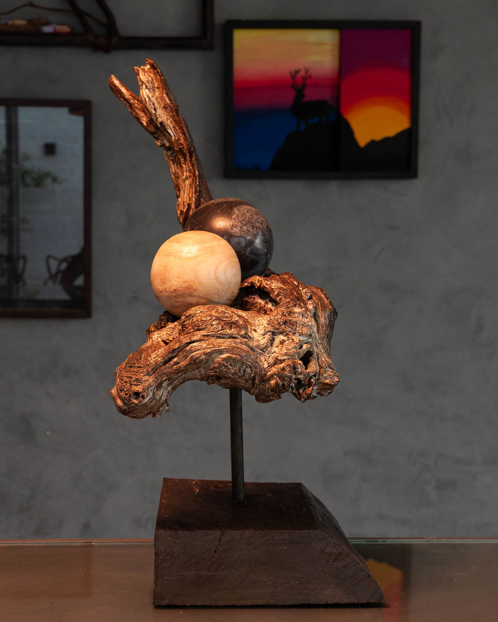 é uma obra visualmente impactante que equilibra a força da natureza com uma simbologia cósmica. Composta por uma raiz esculpida e dois orbes de pedra — um negro e outro claro —, a peça remete ao equilíbrio ao movimento celeste e à dualidade do universo. Um fino eixo metálico sustenta a raiz suspensa, criando um efeito de leveza e flutuação, como se o conjunto desafiasse a gravidade. A raiz de madeira — de aparência orgânica, retorcida e ancestral — se estende horizontalmente, como um tronco cósmico ou uma ponte entre dois mundos. Suas formas irregulares lembram paisagens esculpidas pelo tempo, cheias de texturas e cavidades naturais.