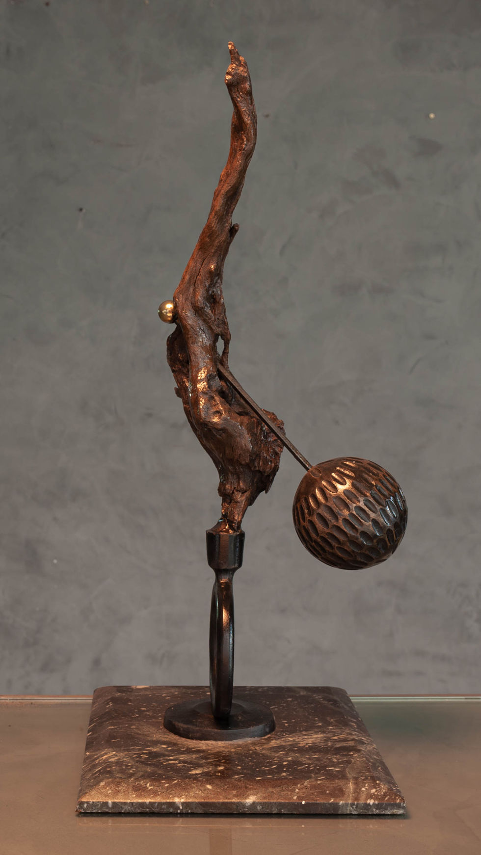 é uma composição elegante e dinâmica, que transmite fluidez, equilíbrio e conexão — características que evocam perfeitamente a dança que lhe dá nome. A obra combina elementos naturais e industriais com uma harmonia surpreendente, criando uma forma que sugere movimento e intimidade congelados no tempo. A escultura está firmemente apoiada sobre uma pedra polida retangular de coloração terrosa. A solidez da base contrasta com a leveza visual do restante da peça. Um anel metálico preto, em posição vertical, serve de sustentação simbólica e literal. Ele pode ser visto como um ponto de encontro ou união entre os elementos — como os corpos dos dançarinos que se entrelaçam.